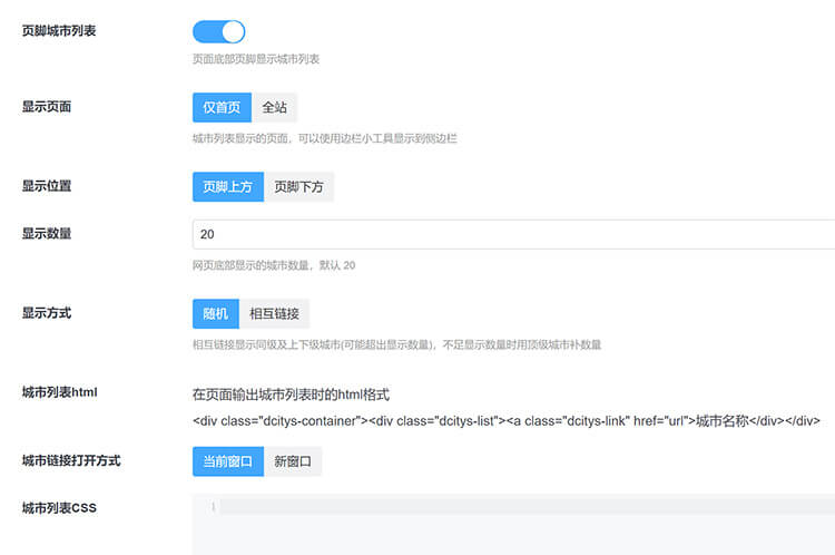 頁腳城市列表: 開啟頁腳城市列表后可以顯示分站的鏈接,類似于友情鏈接,有利于增加頁面的關(guān)聯(lián)及搜錄,顯示位置的頁腳上方和下方 是根據(jù) WordPress 鉤子實現(xiàn),部分不規(guī)范主題可能無效,顯示方式中的相互鏈接顯示規(guī)則為,顯示平級兄弟省市縣的列表,列表樣式跟主題樣式不協(xié)調(diào)時可以在城市列表CSS中進行設(shè)置。可以聯(lián)系我們進行設(shè)置噢