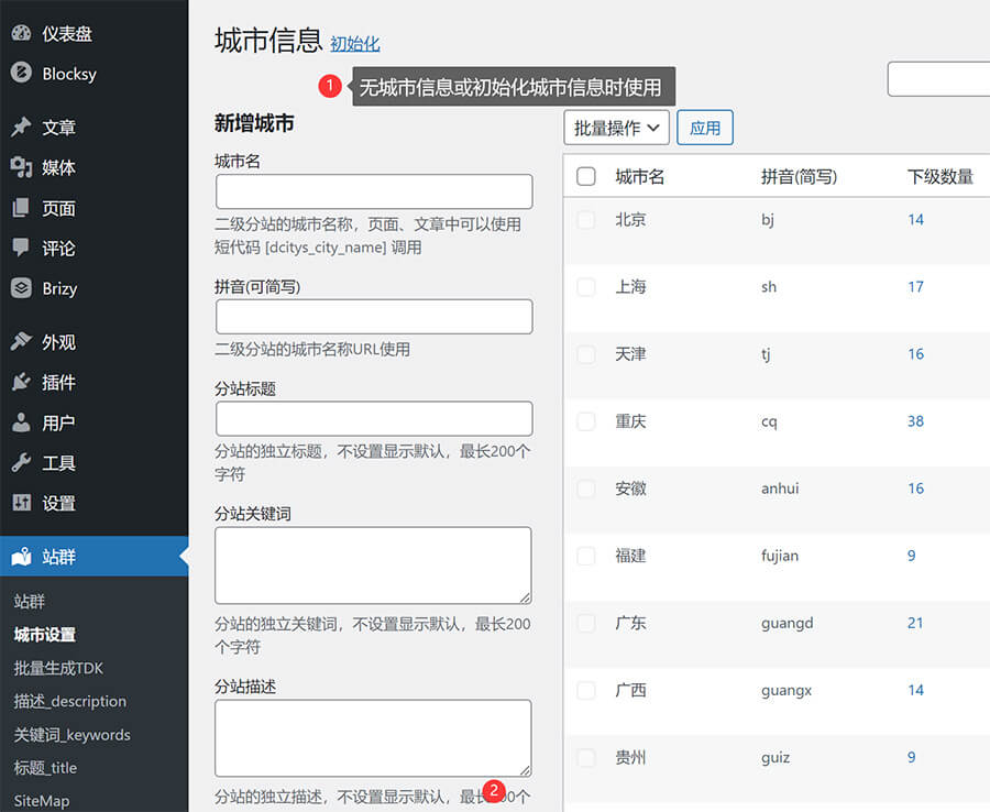 插件安裝后,如果沒(méi)有自動(dòng)生成城市列表,可在站群/城市設(shè)置中點(diǎn)擊初始化,如果存在城市信息再點(diǎn)擊初始化時(shí),會(huì)重新生成城市列表,原有的分站標(biāo)題關(guān)鍵詞會(huì)被覆蓋掉,請(qǐng)謹(jǐn)慎操作