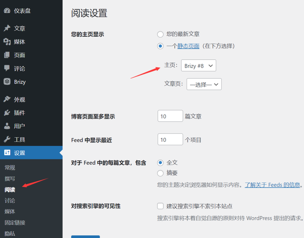 如何首頁是使用Brizy制作的,需要在設(shè)置/閱讀下將頁面設(shè)置為主頁
