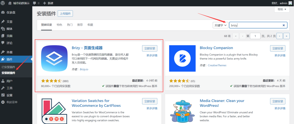 Brizy免費(fèi)版安裝非常簡(jiǎn)單,只需要在后臺(tái)插件頁搜索安裝即可。點(diǎn)擊插件=》安裝新插件,搜索“brizy”,點(diǎn)擊“Brizy – 頁面生成器” 后面的 立即安裝。然后啟用插件