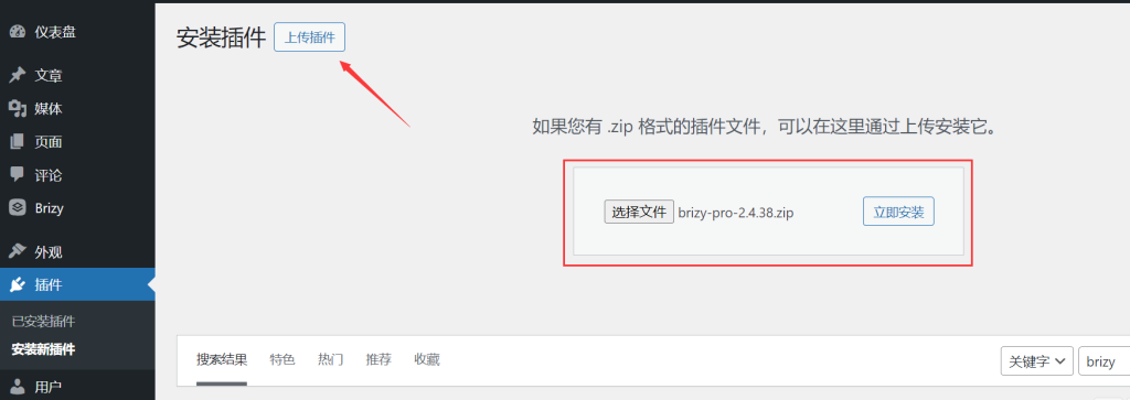 Brizy-PRO 安裝,Brizy-PRO需要先購買,才可以獲取到PRO版的安裝包,點(diǎn)擊上傳插件,進(jìn)行上傳安裝