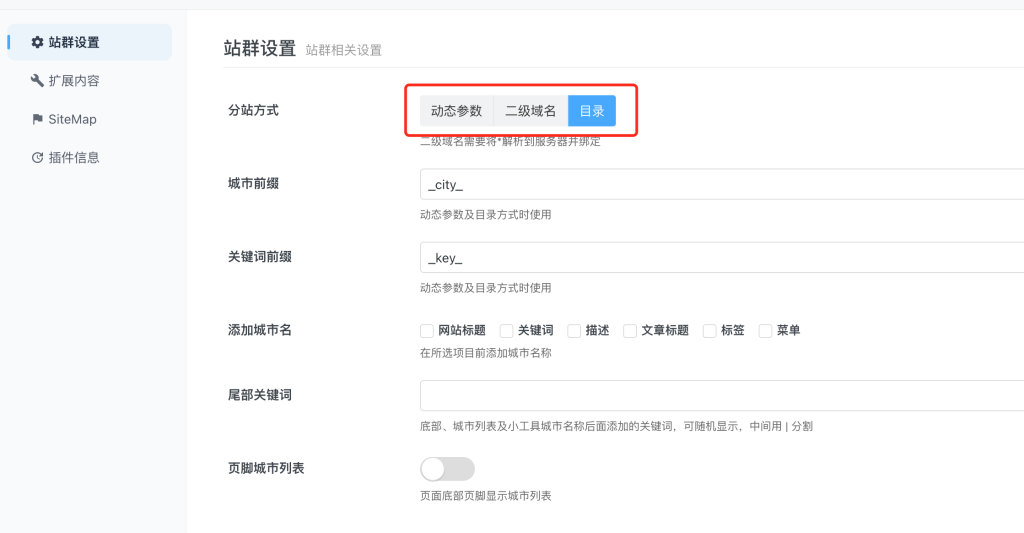 Dcitys城市分站支持動(dòng)態(tài)參數(shù)、二級(jí)域名、目錄形式。
