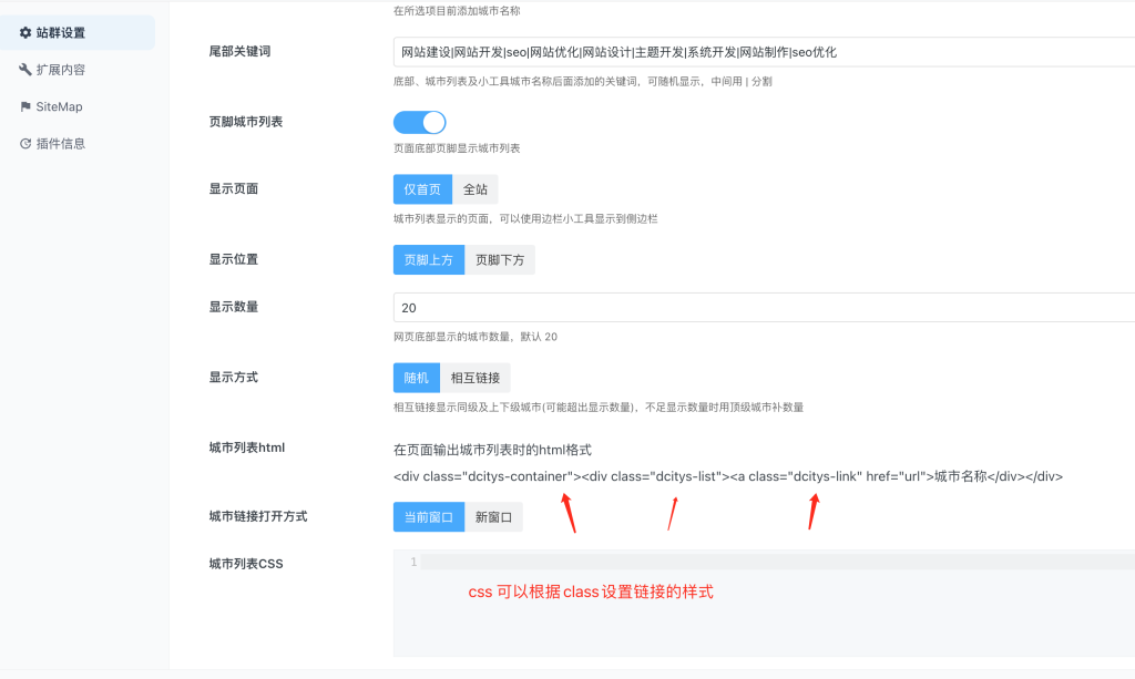 在后臺(tái),打開頁腳城市列表選項(xiàng),可以設(shè)置在首頁或在全站顯示,顯示數(shù)量等,還可以根據(jù)主題進(jìn)行css的設(shè)置,輸入框中要直接輸入css樣式,不能包含其他內(nèi)容