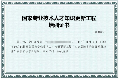 恭喜湖州吉?jiǎng)P思檢測服務(wù)有限公司的李海龍總經(jīng)理與黃佳偉總經(jīng)理助理!他們參與浙江省人力資源和社會保障廳舉辦的高級研修班,并成功斬獲國家專業(yè)技術(shù)人才知識更新工程培訓(xùn)證書,這不僅是個(gè)人專業(yè)能力提升的有力見證,更為公司在裝備失效分析及應(yīng)用領(lǐng)域注入了新的動力與知識資本,有望推動公司在相關(guān)業(yè)務(wù)上取得更為優(yōu)異的成績與突破,值得熱烈祝賀與廣為贊譽(yù)。