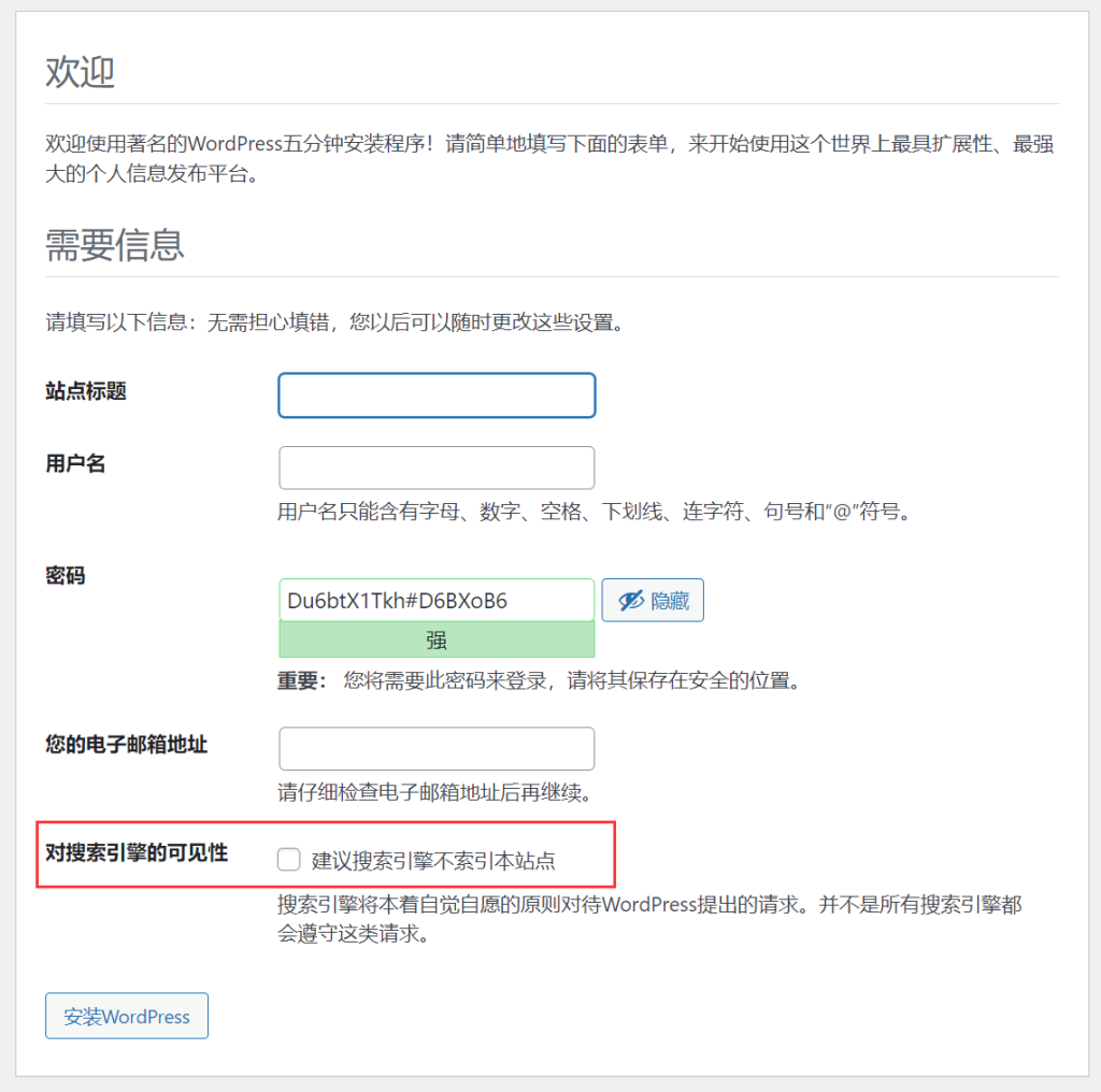 9、填寫網(wǎng)站標題、用戶名、密碼,注意對搜索引擎的可見性一定不要勾選,