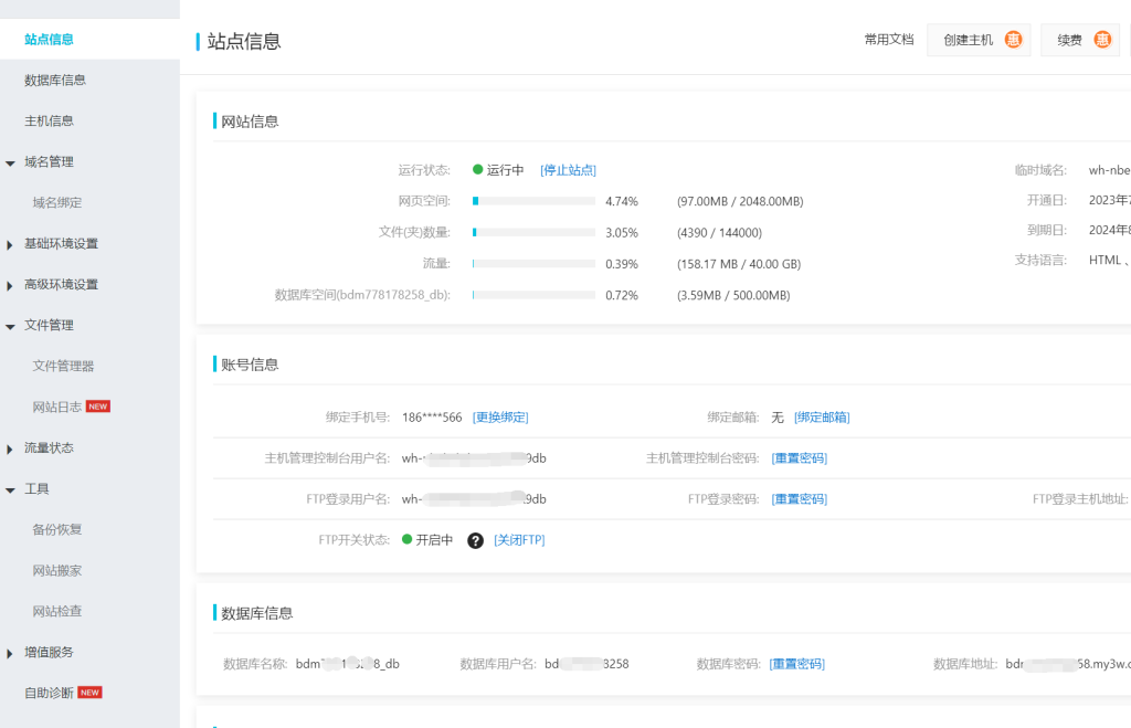 3、虛擬機購買后可在虛擬機管理后臺查看FTP信息及數(shù)據(jù)庫信息,