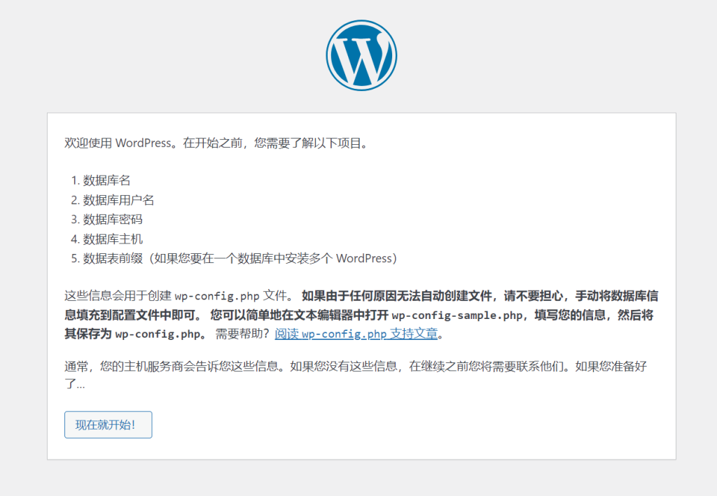 3、訪問網(wǎng)站,出現(xiàn)下面的頁面說明代碼部署正確,可進行安裝,點擊“現(xiàn)在就開始!”