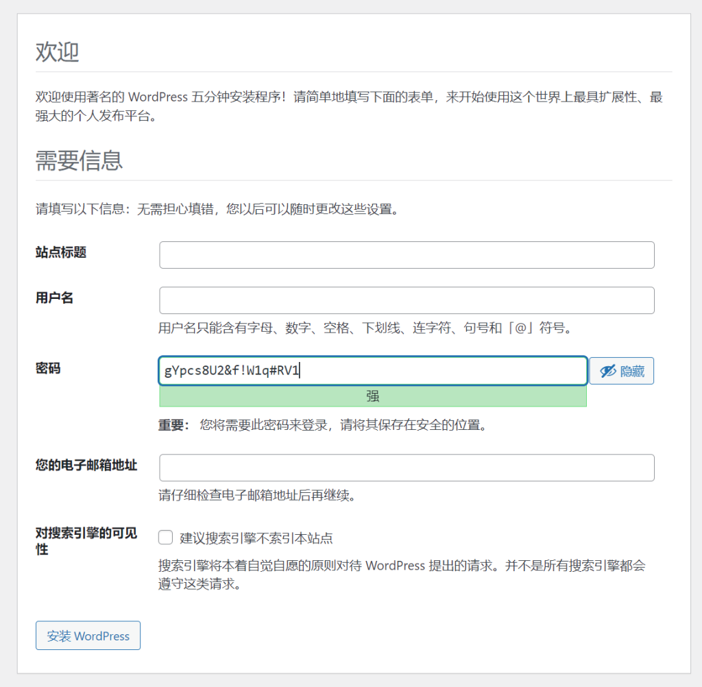 6、設置網(wǎng)站信息,網(wǎng)站標題,用戶名密碼等,注意正常情況下不要勾選“建議搜索引擎不索引本站點”選項,勾選后就不收錄你的網(wǎng)站了。
