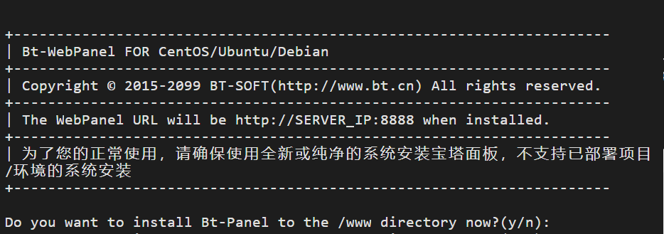 輸入安裝代碼后,按回車后,稍等一會出現(xiàn)如下提示,就是安裝寶塔面板要創(chuàng)建一個www目錄,輸入y 在按回車鍵。
