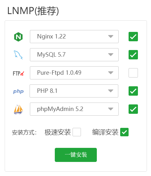 登錄后,需要同意寶塔的安裝協(xié)議并綁定寶塔賬號,如果沒有寶塔賬號需要先注冊一個,登錄后會彈出軟件安裝的界面,可以按下面的進行勾選,選擇編譯安裝雖然慢,但比較穩(wěn)定,