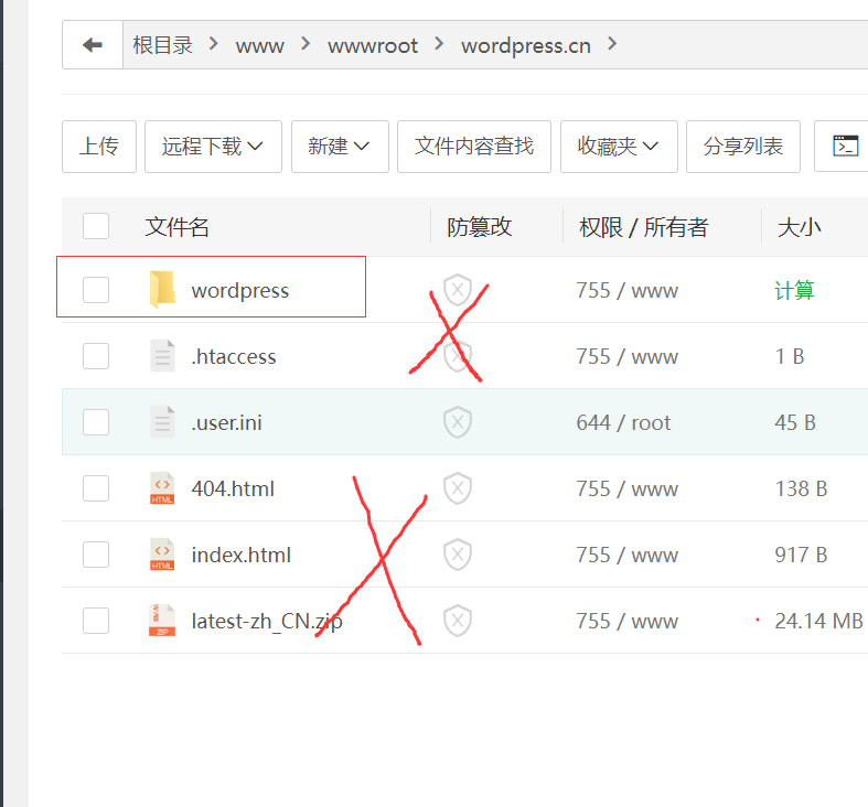 然后就可以上傳WordPress程序并進行安裝了。將下載后的WordPress 壓縮包上傳到網(wǎng)站的目錄中,并進行解壓,解壓后會出現(xiàn)一個wordpress 文件夾,將里面的所有文件復(fù)制到與 wordpress 同級目錄中。并刪除×掉的文件,注意不要選錯。